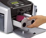 The DTC400e takes the hassle out of handling printer supplies. Its SmartLoad ribbon cartridge combines the printer ribbon and card-cleaning roller into one disposable unit. Just slide in the cartridge, close the door and you're done. No feeding or tearing ribbon rolls, no fumbling with separate cleaning rollers.